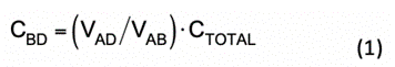 雙電容 CM 噪聲模型可靈活地用于不同的隔離型穩(wěn)壓器拓?fù)洌⒂兄谕ㄟ^實(shí)驗(yàn)測量推導(dǎo)出變壓器集總電容模型[13]。CTOTAL是用阻抗分析儀測得的變壓器結(jié)構(gòu)化繞組間電容,測量時將初級側(cè)和次級側(cè)端子短接,然后將變壓器用作單端口網(wǎng)絡(luò)。對初級側(cè)繞組端子(A、B)施加源阻抗為 50W 的開關(guān)頻率正弦激勵信號,并測量 VAD與 VAB的電壓比,可由公式 1 推導(dǎo)出 CBD: