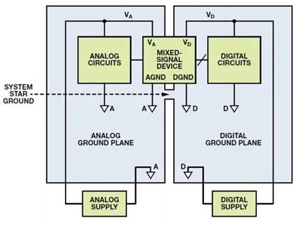 這樣就基本在混合信號器件上產(chǎn)生了系統(tǒng)“星型”接地。所有高噪聲數(shù)字電流通過數(shù)字電源流入數(shù)字接地層,再返回數(shù)字電源;與電路板敏感的模擬部分隔離開。系統(tǒng)星型接地結(jié)構(gòu)出現(xiàn)在混合信號器件中模擬和數(shù)字接地層連接在一起的位置。