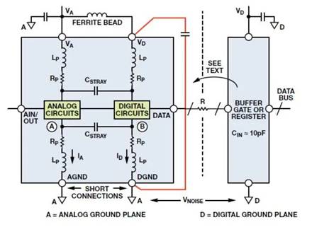 不過,為了防止進一步耦合,AGND 和 DGND 應(yīng)通過最短的引線在外部連在一起,并接到模擬接地層。DGND 連接內(nèi)的任何額外阻抗將在 B點產(chǎn)生更多數(shù)字噪聲;繼而使更多數(shù)字噪聲通過雜散電容耦合至模擬電路。請注意,將 DGND 連接到數(shù)字接地層會在 AGND 和 DGND 引腳兩端施加VNOISE,帶來嚴(yán)重問題!