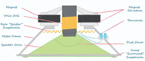 圖 1:標(biāo)準(zhǔn)揚(yáng)聲器結(jié)構(gòu)(圖片來源:CUI Devices)