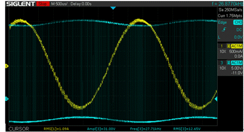 使用之前的設置參數(shù),波形形狀看起來好多了,電流幅度比以前高約