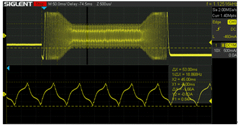 黃色曲線表示通過電機線圈的電流,青色線表示正在接通/斷開的電壓.該測量是在待機期間進行的,此時電機不旋轉,但保持其位置.電流幾乎是恒定的,電壓有規(guī)律地在短時間內(nèi)打開,然后再關閉.請注意,這種切換正在發(fā)生超過30000次每秒!