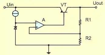 取樣電壓Uin,加在比較器A的同相輸入端,與加在反相輸入端的基準(zhǔn)電壓Uref(Uout*R2/(R1+R2))相比較, 兩者的差值經(jīng)放大器A放大后,Uout=(U+-U-)*A注A為比較放大器的倍數(shù),控制串聯(lián)調(diào)整管的壓降,從而穩(wěn)定輸出電壓。 當(dāng)輸出電壓Uout降低時(shí),基準(zhǔn)電壓Uref與取樣電壓Uin的差值增加,比較放大器輸出的驅(qū)動(dòng)電流增加,串聯(lián)調(diào)整管壓降減小,從而使輸出電壓升高。
