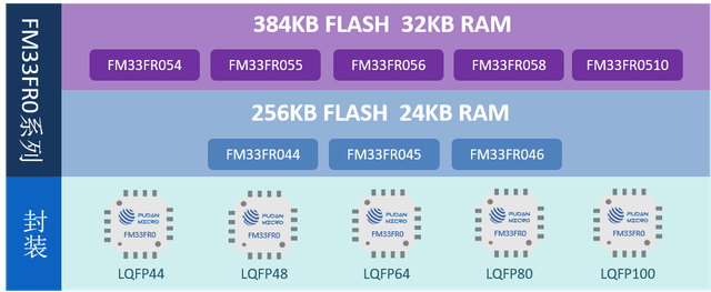 FM33FR0系列基于32位 ARM Cortex-M0內(nèi)核,最高主頻為48MHz,提供最大384KB Program FLASH,8KB Data FLASH(50萬次擦寫),flash支持ECC;最大32KB RAM,帶有奇偶校驗;支持LQFP44 / LQFP48 / LQFP64 / LQFP80 / LQFP100多種封裝形式。