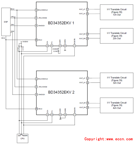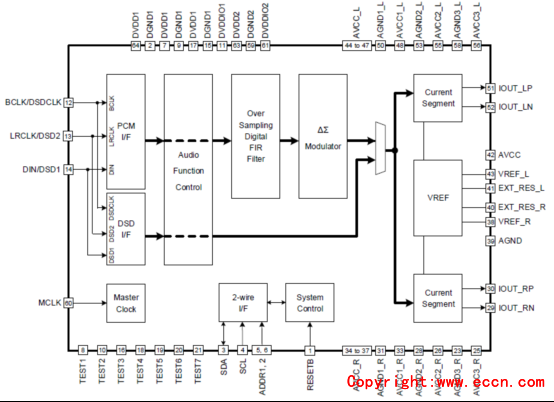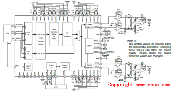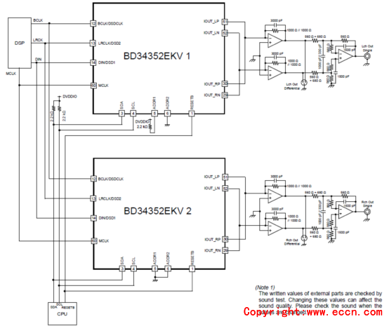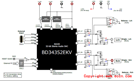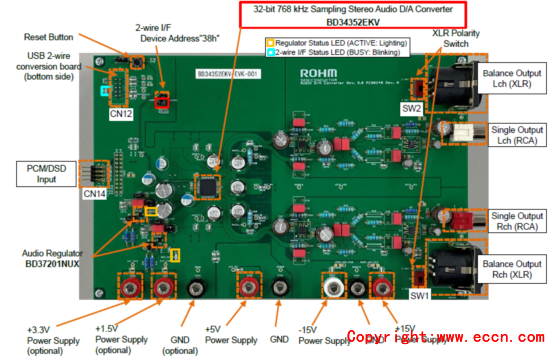 Rohm公司的BD34352EKV是32位高音質立體聲D/A轉換器(DAC),取樣頻率768 kHz,具有ROHM原聲質量設計,具有極好的數字性能(SNR為126dB, THD+N為-112 dB(典型值)),適合于高端音頻設備. 最喜歡的聲音是由切換兩種數字FIR濾波器來選擇(快速滾降, 慢速滾降).PCM I/F 支持高達768 kHz和DSD I/F支持高達22.4 MHz. 器件支持立體聲模式(2路)和單聲道模式(1路),可選擇4種器件尋址(38h, 3Ah, 3Ch, 3Eh). AVCC電壓范圍為4.5V到5.5V,DVDD電壓范圍為1.4V到1.6V, DVDDIO電壓范圍為 3.0 V到 3.6 V,動態(tài)范圍為126dB.工作溫度為-25 °C 到 +85 °C.主要用在CD/SACD播放器,數字音頻播放器(DAP)和USB-DAC與其它.本文介紹了BD34352EKV主要特性和主要指標,框圖和典型應用電路, 測量電路圖,兩路立體聲電路圖,四路輸出和八路輸出應用電路,以及評估板BD34352EKV-EVK-001特性和框圖,電路圖,材料清單和PCB設計圖.