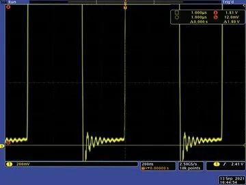 將電池電壓增大到3 V,可以得出圖3所示的開關節(jié)點波形。我們注意到,隨著電池電壓升高,占空比走低,此外,開關節(jié)點下半部的電壓明顯更低,峰值為約80 mV。但是,由于3 V電池電壓的FET電流低于2 V電池電壓,所以很難看出導通電阻是否確實降低。