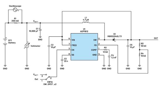 圖1顯示了ADP1612的標準評估套件。其中增加了一個200 mΩ電流檢測電阻,與電池輸入串聯(lián),用于測量輸入電流。在電池輸入電路中增加了一個大型電解電容,用于平滑電感器的電流峰值,以便能夠高度準確地測量檢測電阻上的平均電池電流。電池電壓由數(shù)字電壓表進行測量,因此,可以用電池電壓乘以輸入電流來計算輸入功率。在輸出端增加阻性負載,用輸出功率除以輸入功率,計算得出轉換器的效率。