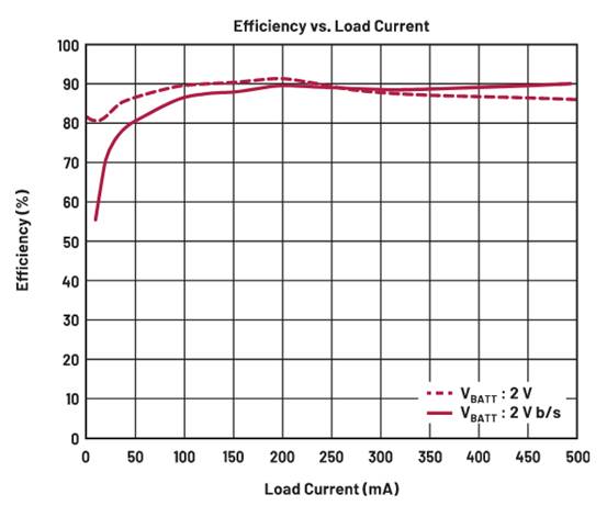 在非自舉電路中,我們可以看到,在電池電壓低于約1.7 V(如藍色曲線所示)時,UVLO電路激活。與之相反,圖4中所示的自舉電路的使能和VIN引腳均連接至輸出電壓(5 V),所以,UVLO電路不會激活,允許電路以更低電壓運行。但是,該電路無法憑空產生功率。ADP1612提供峰值限流功能;所以,負載電流越高,所需的電池電壓也越高,才能達到固定峰值開關電流所需的負載電流。也因此,圖8中的紅色曲線會在負載電流升高時,幾乎成線性增長。