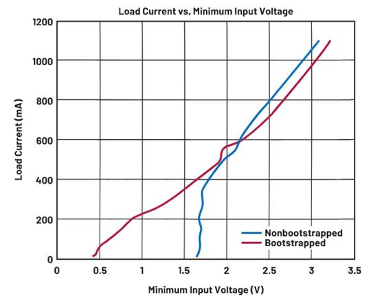 另一個有用實驗是,在輸出電壓開始喪失穩(wěn)壓性之前,查看電池電壓可降低至多低。圖8顯示自舉和非自舉模式之間的比較。