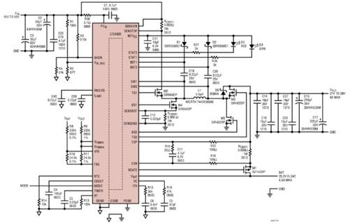 圖 1 示出了一個(gè) 15V 至 55V 輸入、25.2V/6.3A 降壓-升壓電池充電器,其具有一個(gè)高效率四開關(guān) (M2~M5) 同步降壓-升壓型 DC/DC 轉(zhuǎn)換器,僅需一個(gè)電感器(L1)。專有的平均電流模式架構(gòu)采用兩個(gè)檢測電阻器(RCBRT1和 RCBRB1) 來監(jiān)視電感器電流。在該降壓-升壓型解決方案中,當(dāng) VIN高于 VOUT 時(shí),轉(zhuǎn)換器在降壓模式工作;當(dāng) VIN 低于 VOUT 時(shí),轉(zhuǎn)換器則工作在升壓模式。當(dāng) VIN接近 VOUT時(shí),轉(zhuǎn)換器工作于四開關(guān)降壓-升壓模式。