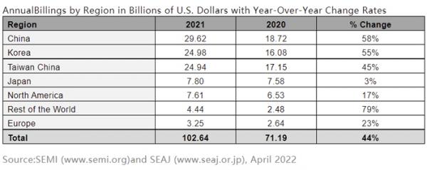 國際半導(dǎo)體產(chǎn)業(yè)協(xié)會SEMI發(fā)布《全球半導(dǎo)體設(shè)備市場統(tǒng)計報告》(Worldwide Semiconductor Equipment MarketStatistics (WWSEMS) Report)指出,2021年全球半導(dǎo)體制造設(shè)備銷售額激增,相比2020年的712億美元增長了44%,達到1026億美元的歷史新高。其中,中國大陸地區(qū)再度成為全球最大的半導(dǎo)體設(shè)備市場。