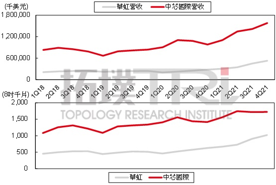 ▲ 2018~2021年每季中芯國際與華虹半導(dǎo)體營收與晶圓銷售量。(Source:公司財(cái)報(bào);拓墣產(chǎn)業(yè)研究院整理,2022.4)