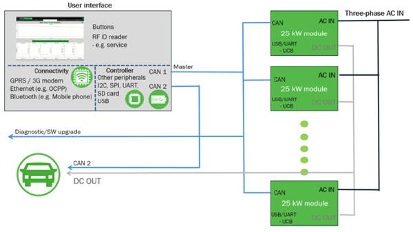 電動(dòng)汽車直流快充標(biāo)準(zhǔn)的演進(jìn),很顯然會(huì)給充電樁的開發(fā)提出新的挑戰(zhàn),這主要體現(xiàn)在兩個(gè)方面:一是產(chǎn)品和方案的架構(gòu)需要能夠適應(yīng)不同標(biāo)準(zhǔn)、不同功率等級(jí)的要求;二是要有可擴(kuò)展性,能夠跟上標(biāo)準(zhǔn)“升級(jí)”的步伐。也就是說,設(shè)計(jì)方案需要有足夠的靈活性。