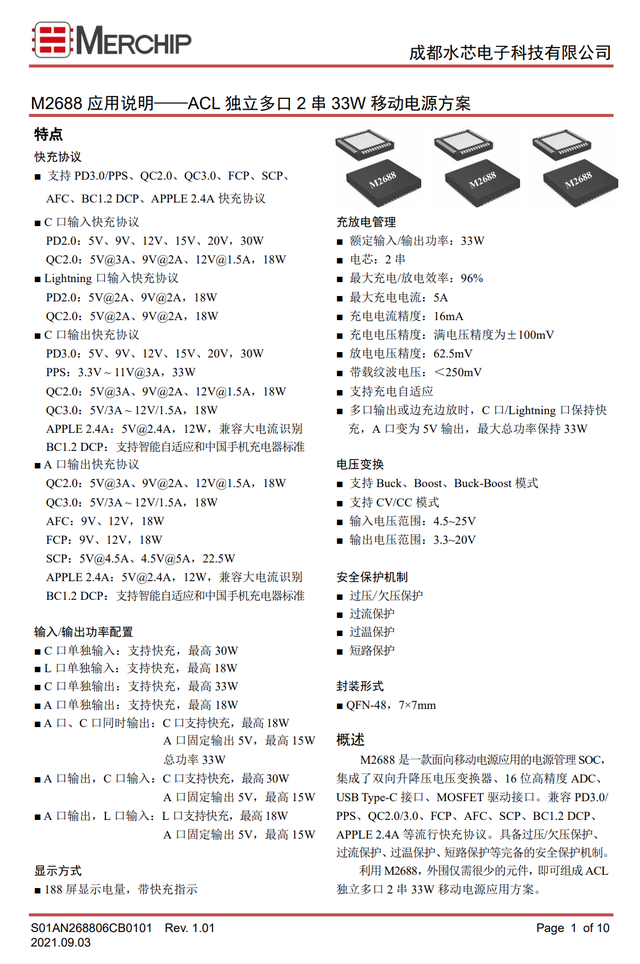 成都水芯的M2688是一款高度集成的電源管理芯片,支持2-6串電池,可以支持30-100W功率,集成全部充電寶功能、快充協(xié)議和MCU功能;贛2688的33W充電寶方案技術(shù)規(guī)格,如下所示。
