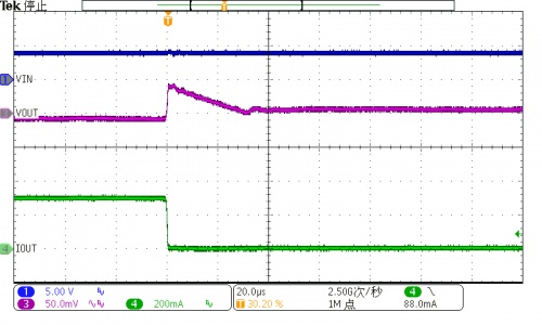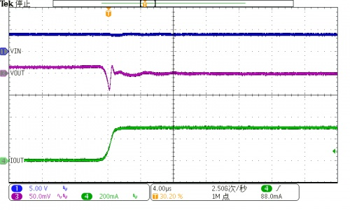 另外,DVDD供電電源需有足夠的響應(yīng)速度,以應(yīng)對圖像傳感器瞬時變化的負(fù)載特性。如下圖所示,WL2848D擁有快速的負(fù)載響應(yīng)特性。