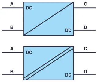 電路設計人員通常將電源視為黑盒子或4極元件。其具有兩個輸入線路和兩個輸出線路。圖1所示為DC-DC轉換器的框圖符號。頂部是非電氣隔離式DC-DC轉換器,底部是電氣隔離式轉換器。