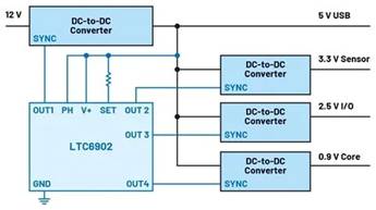 通過(guò)讓系統(tǒng)中的不同開(kāi)關(guān)穩(wěn)壓器同步,可以緩解開(kāi)關(guān)穩(wěn)壓器輸入端產(chǎn)生的輻射發(fā)射和傳導(dǎo)發(fā)射問(wèn)題。許多DC-DC轉(zhuǎn)換器IC具有SYNC引腳,可將時(shí)鐘信號(hào)提供給該引腳。借助內(nèi)部鎖相環(huán)(PLL),每個(gè)DC-DC轉(zhuǎn)換器的開(kāi)關(guān)頻率設(shè)置為所提供的頻率。