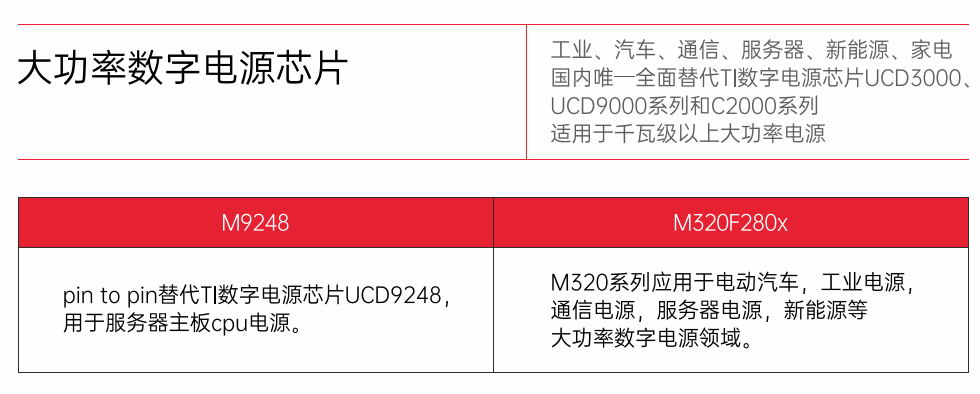 其中,M9248支持pin to pin替代TI數(shù)字電源芯片UCD9248,可用于服務(wù)器主板CPU電源。而M320系列可應(yīng)用于電動(dòng)汽車、工業(yè)電源、通信電源、服務(wù)器電源、新能源等大功率數(shù)字電源領(lǐng)域。