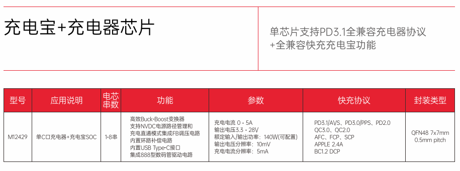 水芯M12429采用OFN48 7×7mm 0.5mm pitch封裝,充電電流0-5A,輸出電壓為3.3-28V,輸出電壓分辨率為10mV,充電電流分辨率為5mA,額定輸出功率最高達(dá)140W,并且支持配置;支持PD3.1/AVS、PD3.0/PPS、QC3.0、QC2.0、AFC、FCP、SCP、APPLE 2.4A、BC1.2 DCP等協(xié)議。