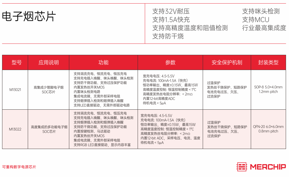 水芯電子針對(duì)電子煙市場(chǎng),推出了M13021和M13022兩款電子煙芯片,這兩款芯片支持MCU、32V耐壓、1.5A快充電流、高精度溫度和阻值檢測(cè)、咪頭檢測(cè)、防干燒等眾多特性。