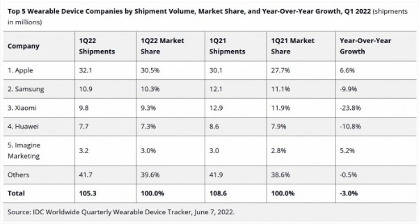 根據(jù) IDC 公布的最新數(shù)據(jù),2022 年第 1 季度全球可穿戴設(shè)備市場(chǎng)出現(xiàn)首次下滑,總出貨量為 1.053 億部,同比下降 3%。下降的主要原因是需求降溫,因?yàn)樵诮?jīng)歷了多年的急劇增長(zhǎng)之后,消費(fèi)者開(kāi)始在可穿戴設(shè)備以外的類別上花費(fèi)更多,而這些增長(zhǎng)在疫情期間進(jìn)一步擴(kuò)大。