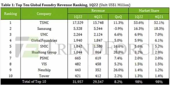 市場研究公司 TrendForce 公布了 2022 年一季度全球十大晶圓代工企業(yè)收入排行榜,臺積電繼續(xù)霸榜,并且進一步擴大了領(lǐng)先優(yōu)勢。