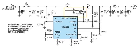 LT8357高壓升壓控制器具有分立式門引腳,用于單獨(dú)控制高功率分立式MOSFET開關(guān)邊緣的上升沿和下降沿。黃色方框圈出了分立式柵極引腳。