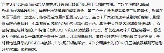 MHz和SSFM,能提供低輻射。EVAL-LT8357-AZ升壓控制器可以實(shí)現(xiàn)相似的性能。有關(guān)這些器件的完整輻射結(jié)果、原理圖和測試選項(xiàng),可以訪問analog.com,查看對應(yīng)的產(chǎn)品登錄頁面。表1列出了一個(gè)新的低EMI異步升壓和SEPIC轉(zhuǎn)換器系列。單芯片IC和控制器IC結(jié)構(gòu)簡單、成本低,采用多種拓?fù),具有大功率功能和低輻射,因此非常?shí)用。當(dāng)超低輻射成為首要的要求時(shí),也可以使用高電流Silent