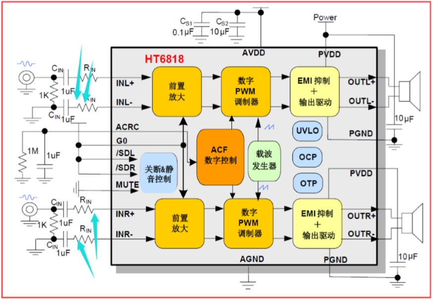 HT6818/QFN-20管腳兼容TPA2012,在替換過程中、有如下區(qū)別: