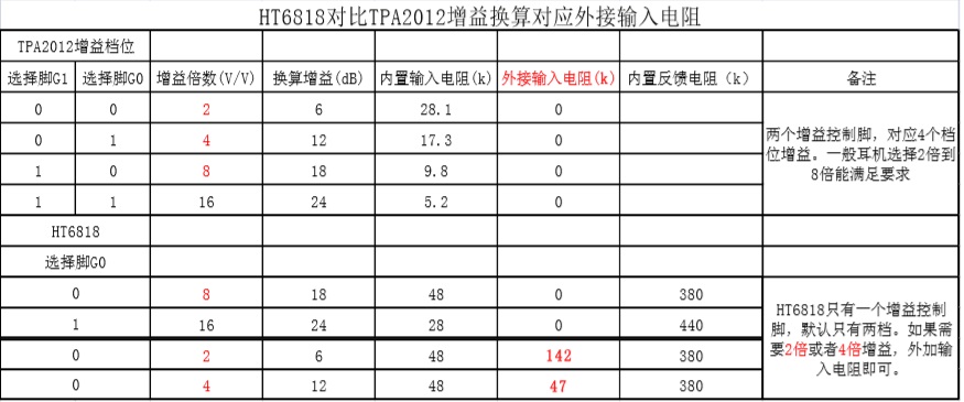 HT6818替換TPA2012時(shí)增益換算對(duì)應(yīng)的輸入電阻值