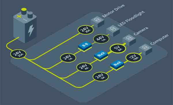 Dusty 的 FieldPrinter 是一款電池供電的移動機(jī)器人,可在各種氣象條件下長期工作。它包括大量不同的電子設(shè)備,包括傳感器、驅(qū)動電機(jī)和電動組件、計算量很大的處理器以及一款打印機(jī)等,所有這些設(shè)備都有不同的工作電壓及電流需求。