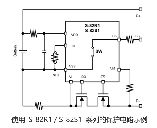 (1)通過使用電池電壓監(jiān)視端子(BS端子),即使在快速充電期間也可以準(zhǔn)確監(jiān)視電池電壓(全系列通用);(2)業(yè)界頂級精度 : 充放電過電流檢測電壓精度為±1 mV(S-82S1系列)、±1.5 mV(S-82R1系列),可以在抑制過電流檢測的變化的同時,降低電流檢測電阻的電阻;(3)通過將NTC熱敏電阻連接到熱敏電阻連接端子(TH端子),實(shí)現(xiàn)過熱保護(hù)功能(全系列通用)。