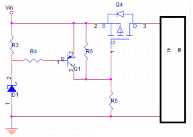 當Vin輸入大于正常輸入電壓,此時Vin>Vbr,穩(wěn)壓管被擊穿,其上電壓為Vbr。PNP三極管Q1導通,VCE≈0,即PMOS管的Vgs≈0,PMOS管不導通,電路斷路,即實現(xiàn)了過壓保護。