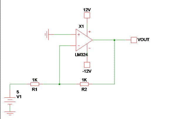 在給定的電路中,正 5V 通過(guò) 1K 電阻器提供給反相端,為了使反相端電壓 = 0,VOUT 應(yīng)為 -5V(由于 R2 = 1K)。如果修改了 R2 的值,則運(yùn)放內(nèi)部結(jié)構(gòu)也應(yīng)修改 VOUT,使 V(In-) = 0。