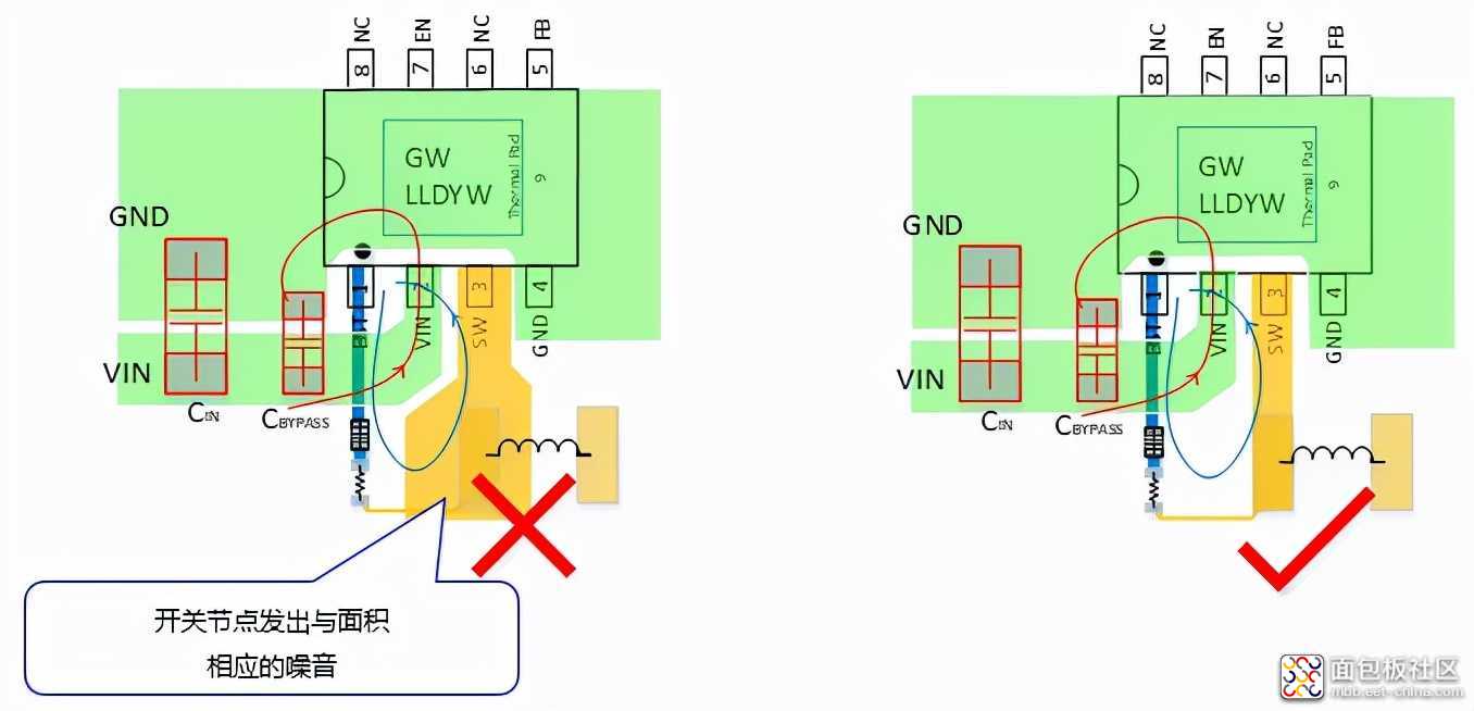√ 關(guān)注芯片工作過(guò)程中的大電流環(huán)路,使其環(huán)路面積盡可能小。BUCK芯片尤其關(guān)注其輸入環(huán)路,BOOST芯片尤其關(guān)注其輸出環(huán)路