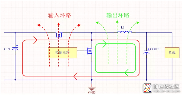 DC-DC芯片布板需遵循一個(gè)非常重要的原則,即開(kāi)關(guān)大電流環(huán)路面積盡可能小。下圖所示的BUCK拓補(bǔ)結(jié)構(gòu)中可以看到芯片開(kāi)關(guān)過(guò)程中存在兩個(gè)大電流環(huán)路。紅色為輸入環(huán)路,綠色為輸出環(huán)路。每一個(gè)電流環(huán)都可看作是一個(gè)環(huán)路天線,會(huì)對(duì)外輻射能量,引起EMI問(wèn)題,輻射的大小與環(huán)路面積呈正比。