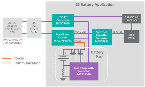 另一個必須考慮的因素是使用大容量電池,高耗電的終端設(shè)備需要這些電池來維持更長的運行時間。相比于1S電池,2S電池可以在不增加充電電流的情況下增大容量。由于USB-C支持5V到 20V之間的輸入電壓,而2S或3S電池的電壓介于這兩者之間,因此借助降壓-升壓轉(zhuǎn)換器可以彌補這一差距。圖2給出了基于2S電池應(yīng)用的示意流程圖。