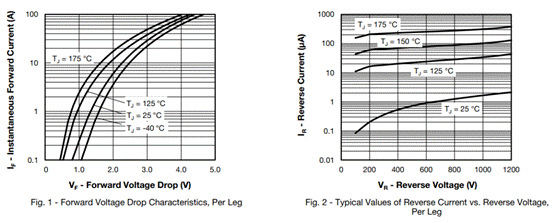 圖3:正向壓降特性以及反向電流、反向電壓典型值(圖源:Vishay)