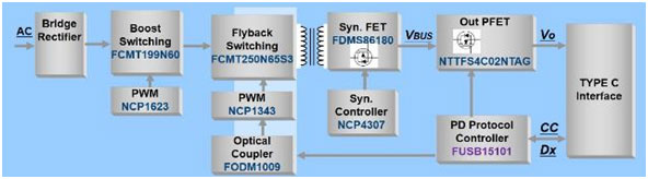 由于電源輸出功率在75W以上,就需要在電路設(shè)計(jì)中增加PFC電路來(lái)達(dá)到高功率因數(shù)下的行業(yè)標(biāo)準(zhǔn)。因此,本方案除了采用onsemi旗下新一代QR Flyback控制器NCP1343外,還在電路前級(jí)使用onsemi NCP1623作為PFC級(jí)的控制,提高了設(shè)計(jì)需求。并在輸出控制級(jí)增加onsemi FUSE15101的設(shè)計(jì)滿足了PD3.0/PPS協(xié)議標(biāo)準(zhǔn)。