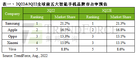 OPPO(含 realme、一加)生產(chǎn)數(shù)量為 3,880 萬部,季減 4.2%;小米(含 Redmi、POCO、黑鯊)第二季生產(chǎn)數(shù)量為 3,800 萬部,季減幅度達(dá) 14.6%;vivo(含 iQOO)因?yàn)榈谝患炯撮_始大幅調(diào)整生產(chǎn)節(jié)奏,因此在第二季回升至 2,570 萬部,季增 12.7%,上述三家品牌分別位居第三名至第五名。