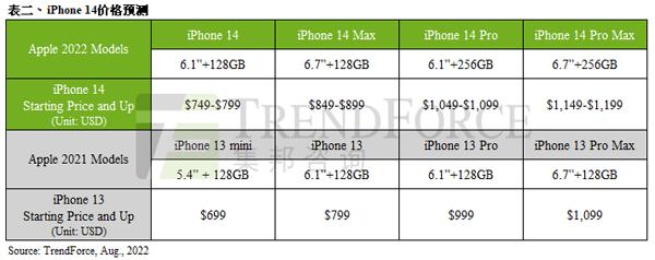 第二季為蘋果新舊機(jī)種交接的過渡期,且多為年度生產(chǎn)表現(xiàn)最低的一個(gè)季度。第二季因上海、昆山等地受疫情影響,在供應(yīng)鏈補(bǔ)給受到?jīng)_擊的狀況下,第二季仍有 4,820 萬部的產(chǎn)出,位居全球第二。TrendForce 還預(yù)測了即將發(fā)布的 iPhone 14 系列新機(jī)的售價(jià),稱四款新機(jī)當(dāng)中的 iPhone 14 Pro 及 Pro Max 處理器將升級至 A16(TSMC 4nm),存儲器起始容量提升至 LPDDR5 6GB 以及 256GB,主鏡頭像素增加為 4,800 萬,加上 Face ID 外觀設(shè)計(jì)變更等,預(yù)估起始定價(jià)也將隨之上揚(yáng)。不過在全球高通脹以及匯差的壓力下,蘋果可望采取更謹(jǐn)慎的定價(jià)格策略以免影響銷售表現(xiàn),預(yù)估價(jià)格上漲幅度應(yīng)有機(jī)會落在 100 美元以內(nèi),售價(jià) 749 美元(約 5175.59 元人民幣)-1199 美元(約 8285.09 元人民幣)。