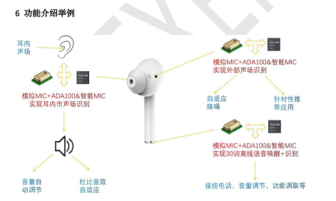將麥克風(fēng)的模擬mic與ADA100相結(jié)合可以對于耳內(nèi)的聲場進行識別,從而實現(xiàn)音量和音效的自適應(yīng)調(diào)節(jié);對于外部聲場也能進行識別,從而做出自適應(yīng)降噪,降低降噪消耗的功耗,提升續(xù)航時間;ADA100還擁有30個關(guān)鍵詞的識別,可以通過語音控制來進行電話的接掛、音量大小的調(diào)控、音樂的切換等人機交互功能,更加的快速便捷。