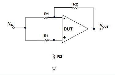 有不同的方法來測量共模抑制比。在下圖中,小編將運(yùn)算放大器配置為差分放大器的四個(gè)精密電阻。一個(gè)信號(hào)應(yīng)用于兩個(gè)輸入,測量輸出的變化,一個(gè)具有無限CMRR的放大器也沒有輸出變化。