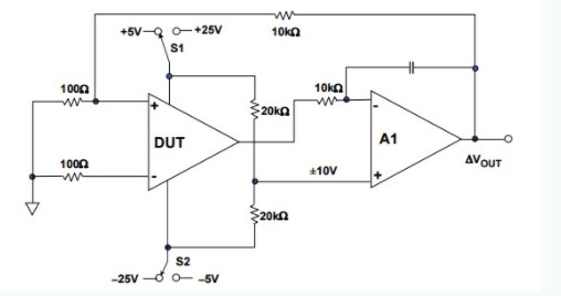 與上述電路相比,以下電路更為復(fù)雜,無需使用精密電阻即可測量CMRR。通過切換電源電壓來改變共模抑制比。實(shí)際上,該電路可以很容易地實(shí)現(xiàn),并且通過使用相同的電路,可以應(yīng)用不同的電源電壓來測量電源抑制比。