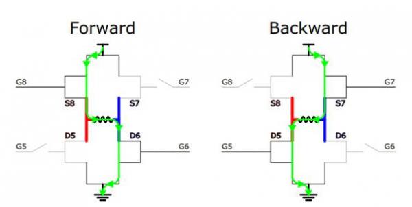 當(dāng)激活一對(duì)(對(duì)角相反的)MOSFET時(shí),電機(jī)會(huì)看到電流沿一個(gè)方向流動(dòng),而當(dāng)另一對(duì)MOSFET被激活時(shí),通過(guò)電機(jī)的電流會(huì)反轉(zhuǎn)方向。