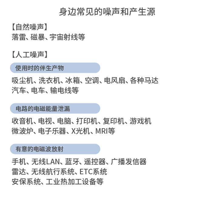 噪聲分為自然噪聲和人工噪聲。自然噪聲的產(chǎn)生源是落雷、空中放電、宇宙射線等。人工噪聲的產(chǎn)生源是電子設備。電子設備分為廣播發(fā)信器等有意發(fā)射電磁波的類型、收音機和電視等從內(nèi)部泄漏電磁能量的類型,以及電動清掃機和工具等使用時會隨之產(chǎn)生電磁波的類型。