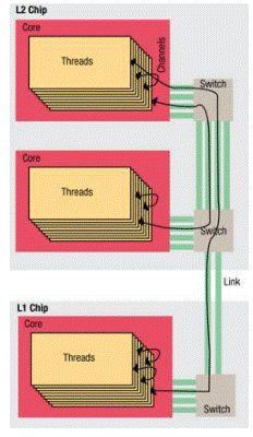 圖 1:線程、通道、內(nèi)核、交換機(jī)和鏈接。并發(fā)線程通過內(nèi)核內(nèi)部、芯片上的內(nèi)核之間或不同芯片上的內(nèi)核之間的通道進(jìn)行通信。