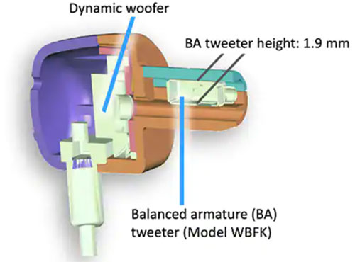 解決辦法是將低音和高音頻率分給一個動態(tài)低音單元和一個獨立的平衡電樞 (BA) 高音單元。BA 高音單元是一種專用組件,最初是為助聽器應(yīng)用而開發(fā)的,現(xiàn)在越來越多地被用于提升高品質(zhì)耳塞的高音響應(yīng)。在 BA 高音單元中,電子信號會振動一個微小的簧片,平衡緊湊外殼內(nèi)的兩個磁鐵;善倪\動被轉(zhuǎn)移到一個非常堅硬的鋁制振膜上,從而產(chǎn)生聲音。