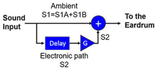 圖 4 中的變量有延遲和增益 (G)。S1 信號直接進(jìn)入耳膜。通過將環(huán)境中的 S1 聲音添加到電子 S2 路徑中,S2 中的增益功能就會產(chǎn)生一個延遲。S1 和 S2 的加入有可能產(chǎn)生回聲,但這可以通過操縱延遲時間和增益大小來減少。