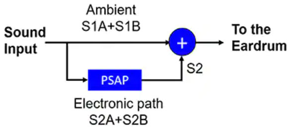 PSAP 的麥克風(fēng)捕捉環(huán)境聲音 (S2) ,DSP 對其進(jìn)行處理,輸出信號 (S2A) 通過音頻換能器送入耳道。重要的是,音頻處理鏈的設(shè)計產(chǎn)生了一個延遲。這三個聲音匯集到用戶的耳膜,產(chǎn)生了 PSAP 體驗。